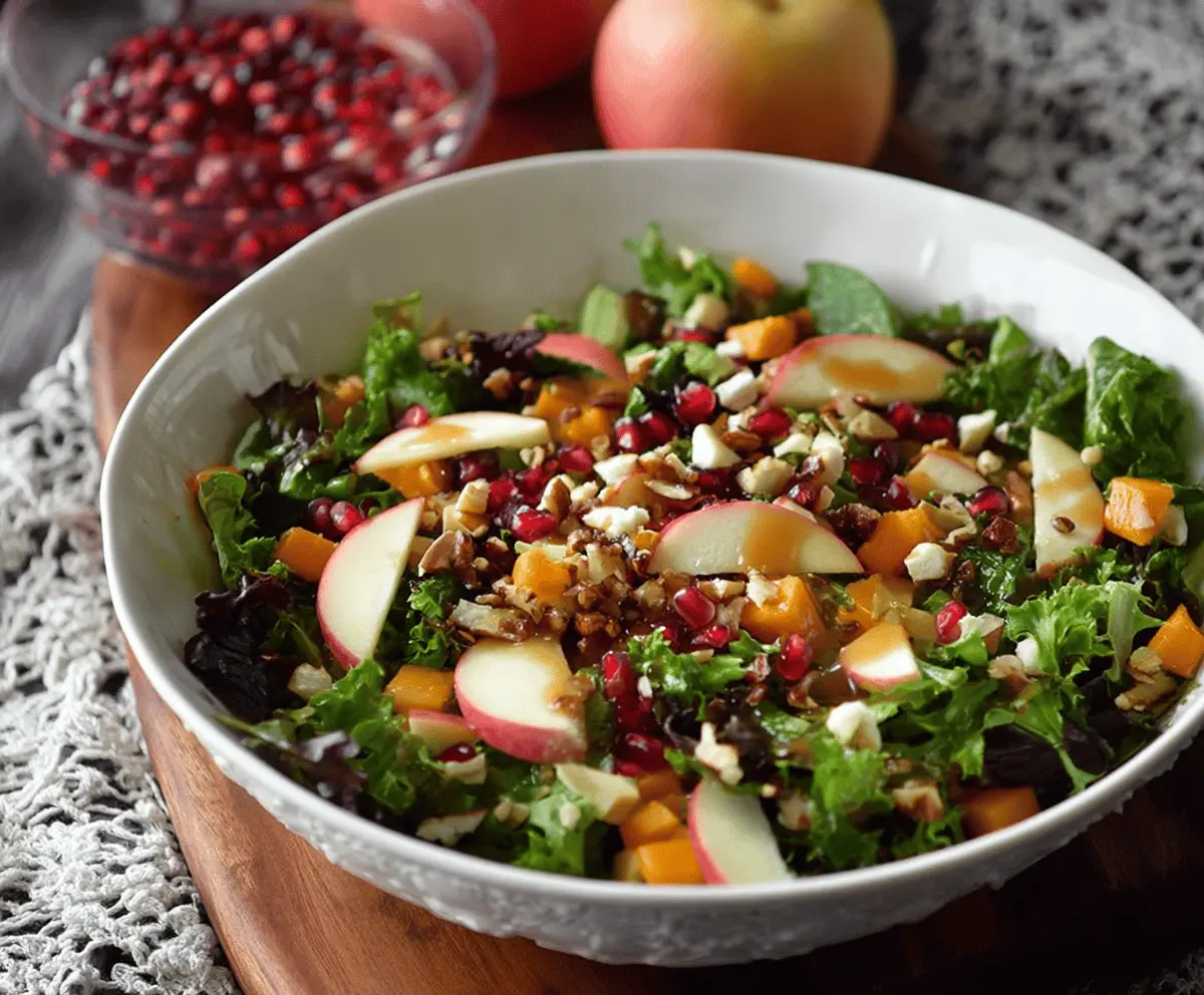 This recipe beautifully highlights autumn flavors, combining sweet apples, savory roasted squash, tart pomegranate, crunchy nuts, and a tangy apple cider vinaigrette—making it a perfect dish to celebrate the season!